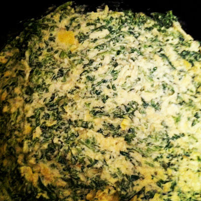 3. In a medium bowl, mix together spinach, heavy cream, sour cream and mozzarella cheese. Stir in artichoke mixture. Spoon into prepared baking dish.