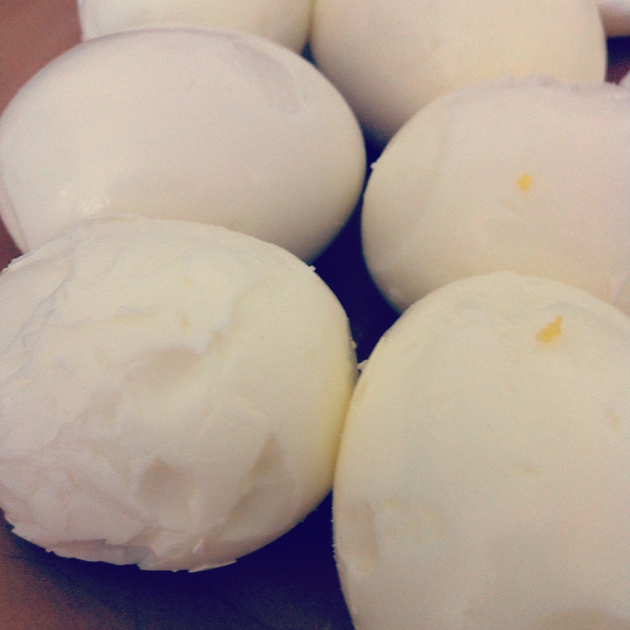 Place the eggs in a large saucepan just large enough to hold them in a single layer. Add enough cold water to cover by one inch. Bring to a boil over high heat. Reduce the heat to low and simmer for 10 minutes. Drain carefully and rinse under cold water. When cool enough to handle, but still warm, peel the eggs. Cool completely.