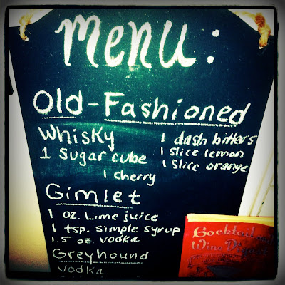 Having a bar with vintage cocktail recipes makes the night. I wrote the ingredients on a chalk board so people could “make their own”.. each glass went with a specific recipe.